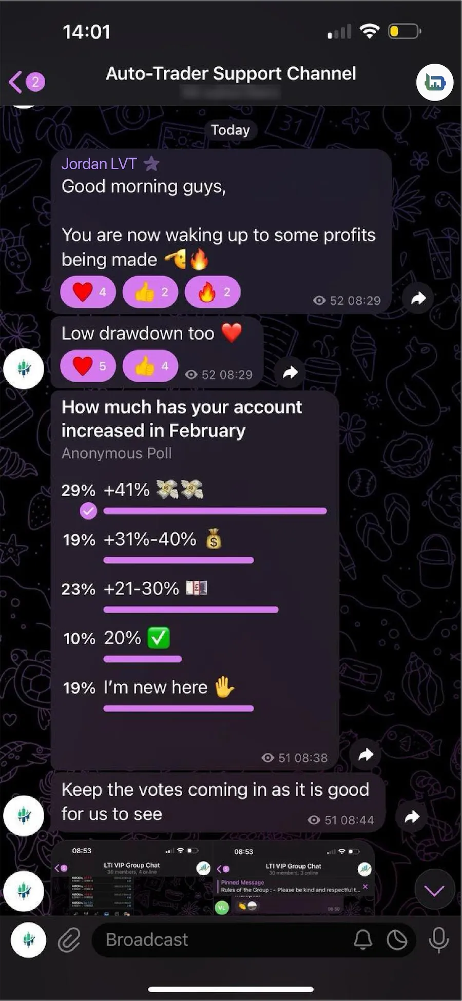 Most trading channels keep you in the dark no community, no real discussions, just faceless messages and cherry-picked screenshots. Our client channel is a space where everyone connects and talks openly about their experiences. You’re part of a network that collaborates and profits together. Members discuss everything because we have nothing to hide.